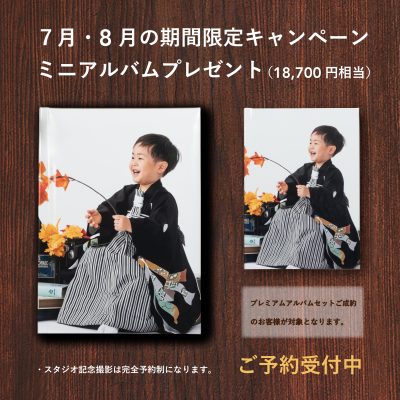 7月・8月にスタジオ撮影のご予約をいただいたお客様限定で、ミニアルバム(18,700円相当)をプレゼ…